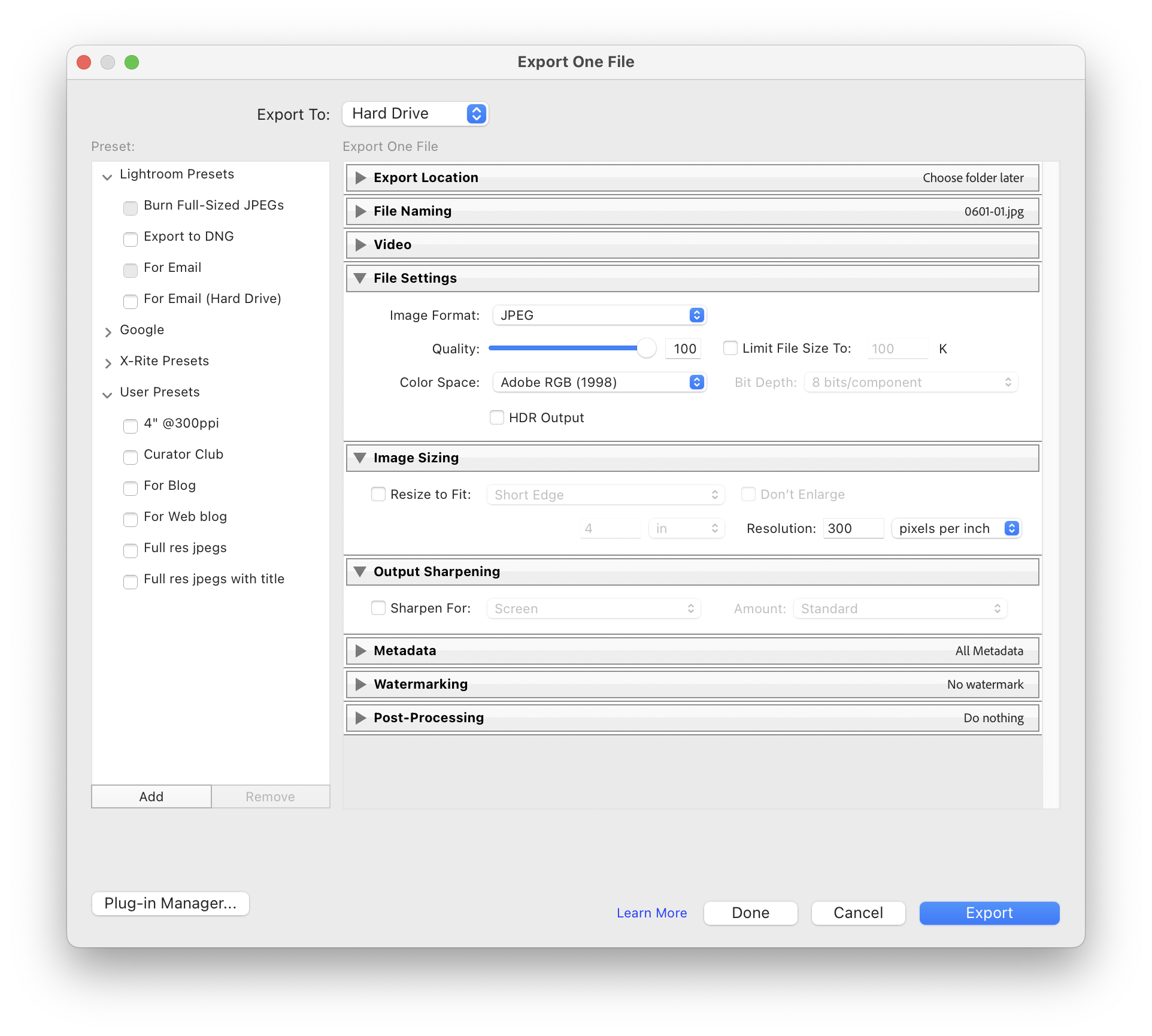 When exporting, there are only three areas of concern in the export options; 1. File Settings, choose either AdobeRGB or sRGB, depending on your workflow (sRGB if going to a web gallery such as Pic-Time). 2. High quality Jpeg. 3. Output Sharpening should be off.
